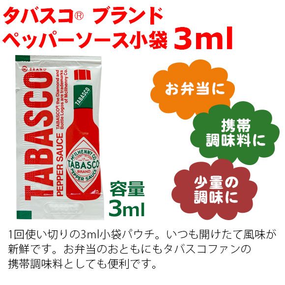 タバスコペパーソース3mlのパウチ小袋。お弁当や携帯の調味料に便利です。