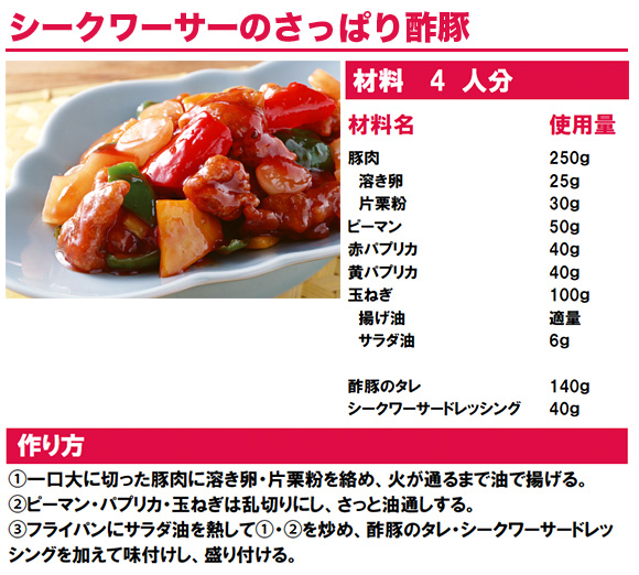 原材料名 砂糖(国内製造)、醸造酢、シークヮーサー果汁、食塩、香辛料/増粘剤(加工デンプン、キサンタン)、調味料(アミノ酸)